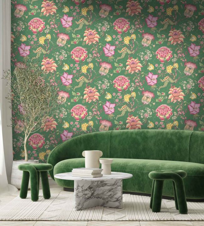 تصميم أركاديا الجريء والجميل من وودشيب آند ماغنوليا مستوحى من فكرة السلام والرضا. حديقة زاخرة بالأزهار الغريبة والكروم المتدلية، مستوحاة من التصميم الصيني والشرقي، مع لمسة عصرية وملهمة من خلال مجموعة مختارة من ألوان الخلفية الزاهية والجميلة.