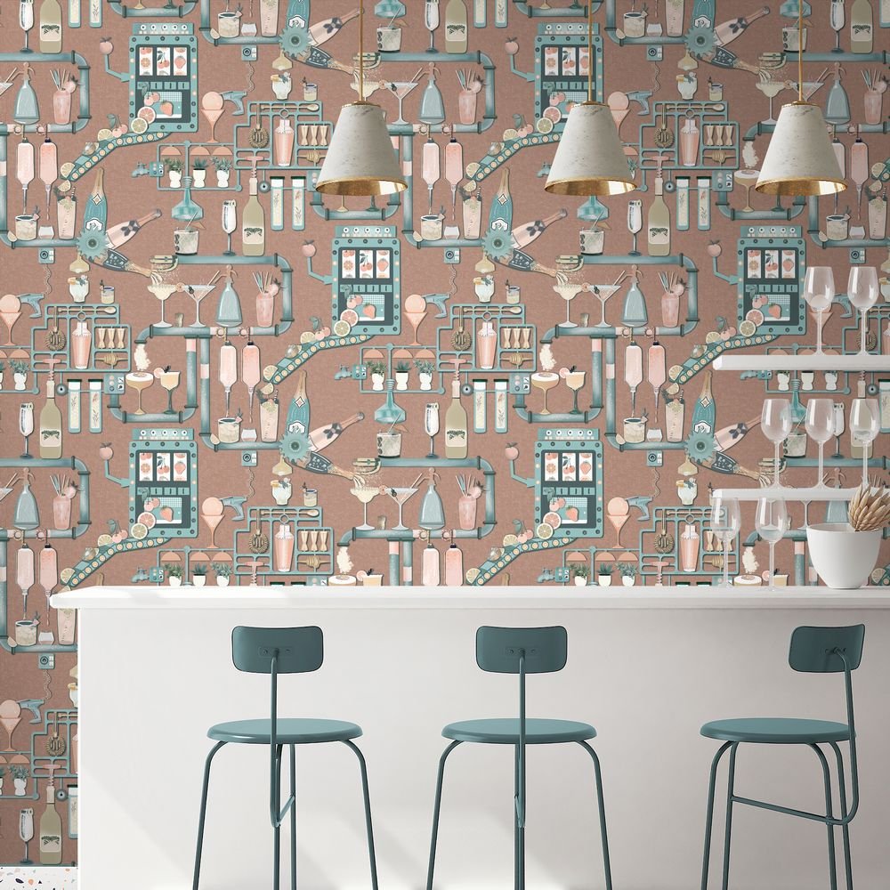 Step into a playful world where science meets mixology in Liquid Lab, a whimsical wallpaper design that transforms your walls into a cocktail-making wonderland.