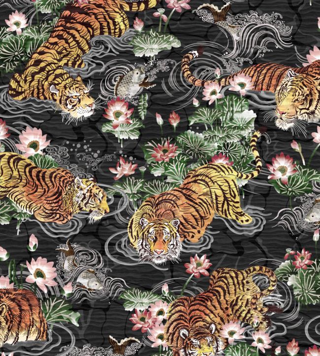 يتميز عطر Tiger Lily من Brand McKenzie بنمور أنيقة تتجول، مما يخلق تموجات في الماء محاطة بزنابق الماء والزهور، بينما تصنع الأسماك الطائرة دفقة من الماء.