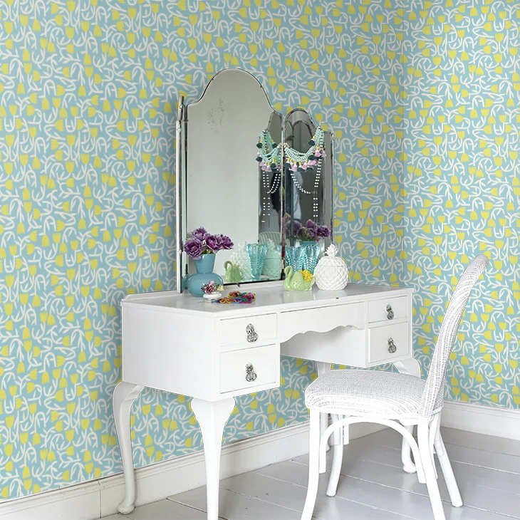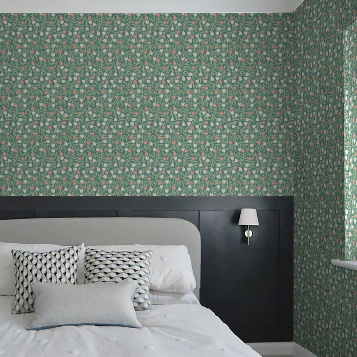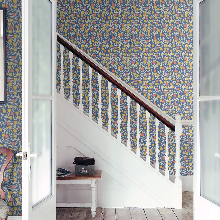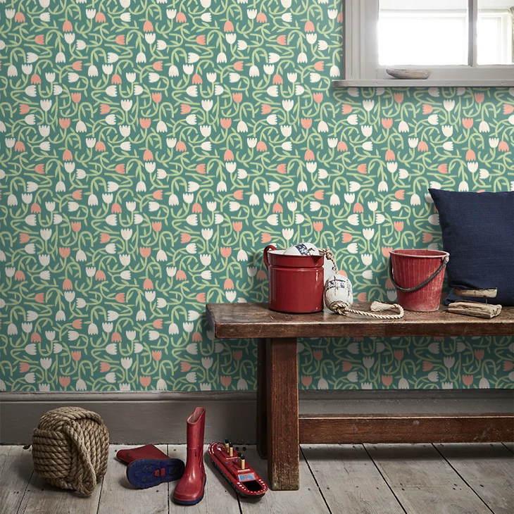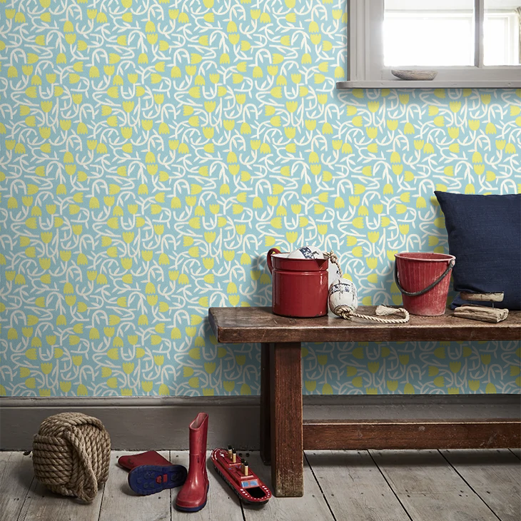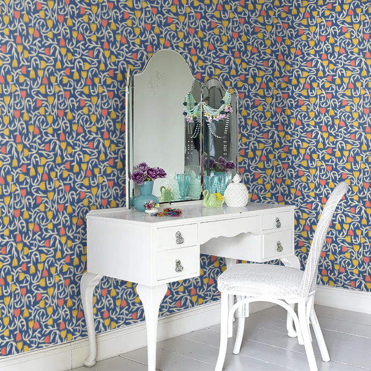 Tiny Tulip is a charming and playful design featuring intertwined, stylised tulips. Pops of colour and curving stems guide your eye across the room, bringing life and a sense of cheerfulness to any space. A subtle painterly texture adds depth to the design, giving it an organic feel.