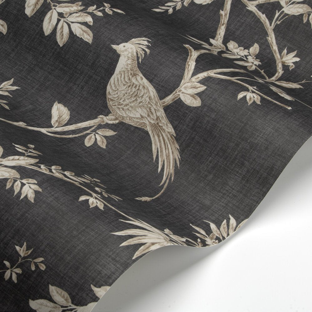 An elegant floral design featuring trailing branches and perching birds. The ground has a luxurious brushed effect for a fabric look.