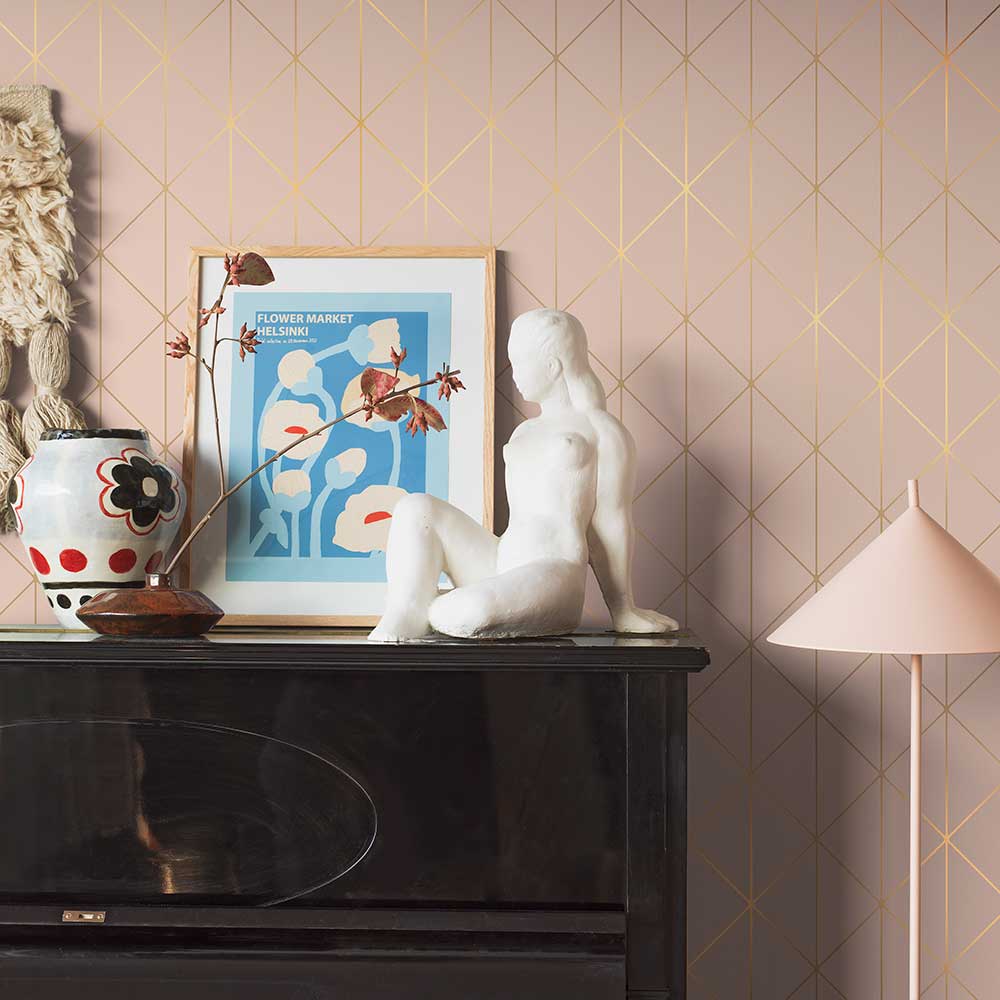 A sweet, finely drawn diamond trellis pattern.