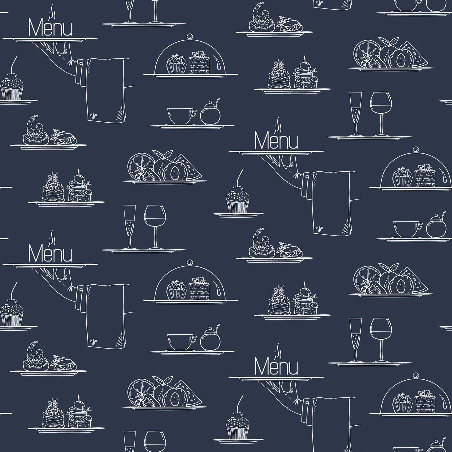 A fun and quirky design featuring a selection of food and drinks on plates, there is also a drawing of a waiter's hand holding a plate with the text 'Menu'.