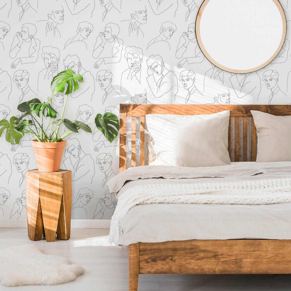 Designed for fans of minimalist art, this monochrome line art wallpaper is a subtle print that’s the perfect finishing touch for a modern home. This wallpaper features simple line drawings of male figures on a clean white backdrop. We recommend hanging this line art wallpaper in a living room, bedroom or home office.