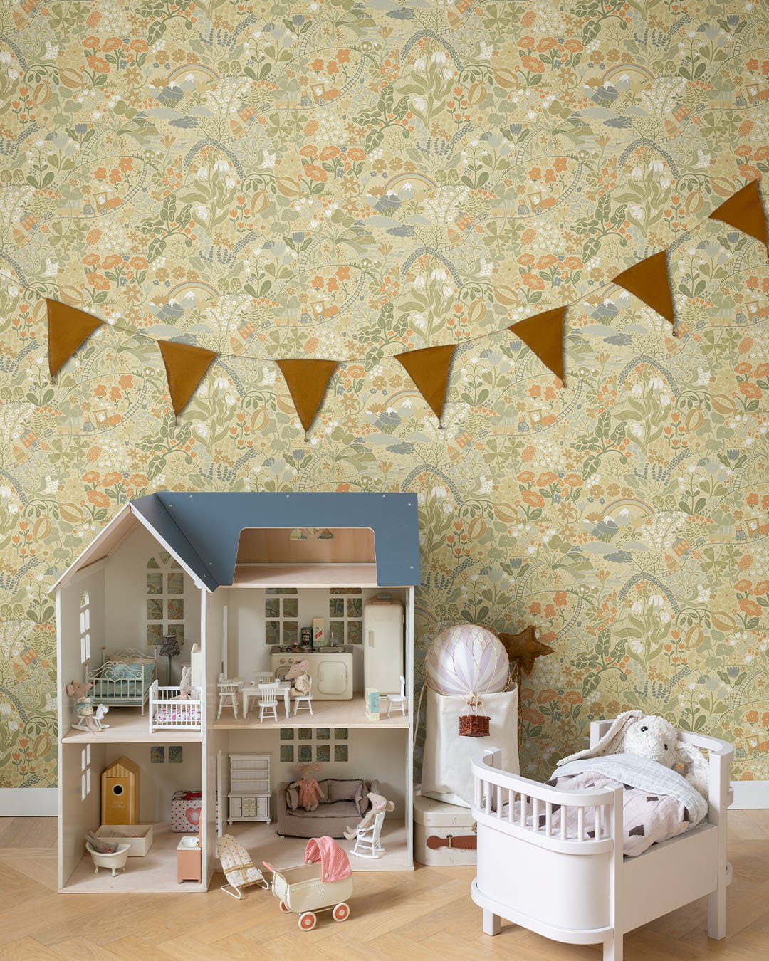 In the children's wallpaper Tåget, translates The Train, we travel over hills and through deep valleys. Exotic plants grow, thunder rumbles over the sea and the sun rises over snow-capped mountains. The little train travels on its journey through changing landscapes.