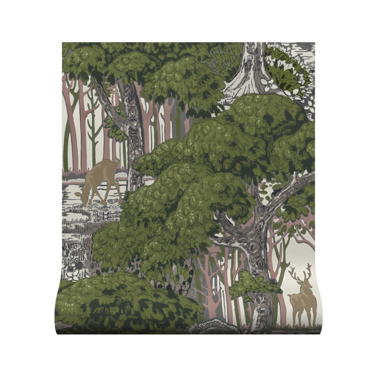A woodland scene with deer, this very modern wallpaper design seeks its inspiration from early 20th century block printed linens and is printed in two contrasting colourways, one bold and one pale.