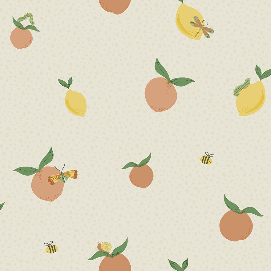 Tutti Fruity is a stylised design featuring peaches, oranges and lemons with cute detailed bugs, on a subtle spotted background.