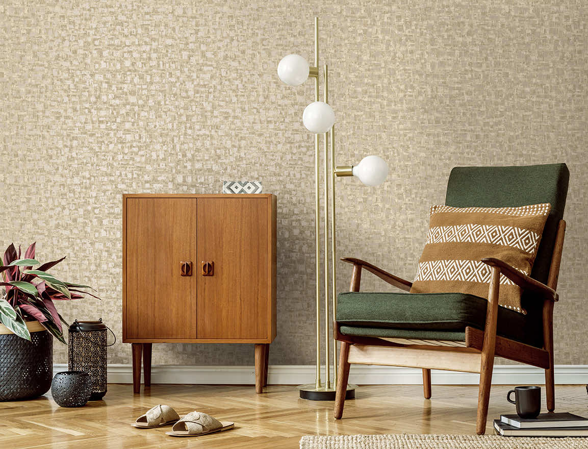 A design featuring brushed blocks that stack and overlap, resulting in a flowing composition and three dimensional feel. Added brushed texture and metallic accents softens the structured layout and created depth. PVC-Free textured wallcovering.