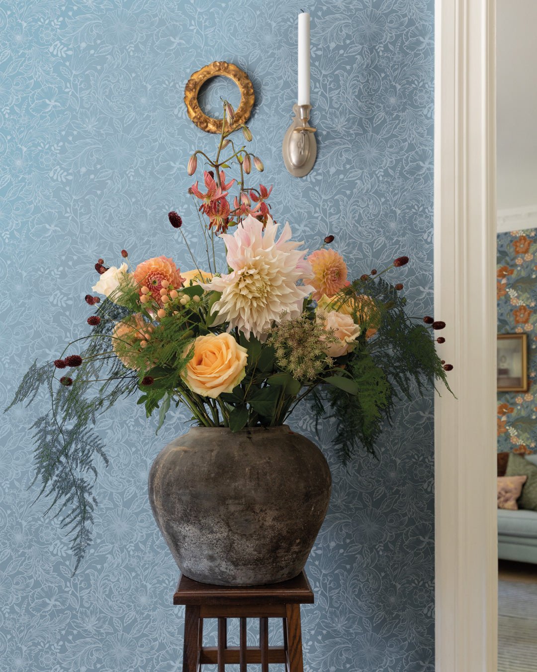 Fix the style with the beautiful wallpaper Wilma. This wonderful light wallpaper with its tone in tone patterned motif with flowers and leaves gives the room a stylish touch. The neutral tones do not take over the wall but create a mysterious feeling.